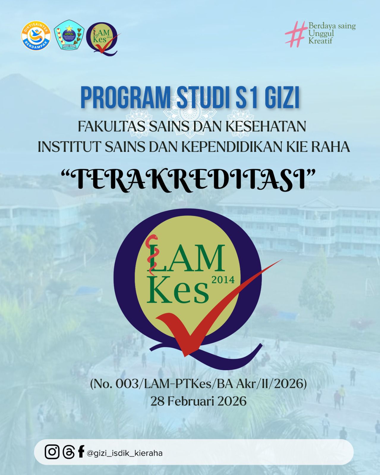 Topikberita. id. Ternate. Program Studi (Prodi) Sarjana Gizi Fakultas Sains dan Kesehatan (FSK) Institut Sains dan Kependidikan Kie Raha Maluku Utara resmi memperoleh status terakreditasi dari Lembaga Akreditasi Mandiri Pendidikan Tinggi Kesehatan Indonesia.