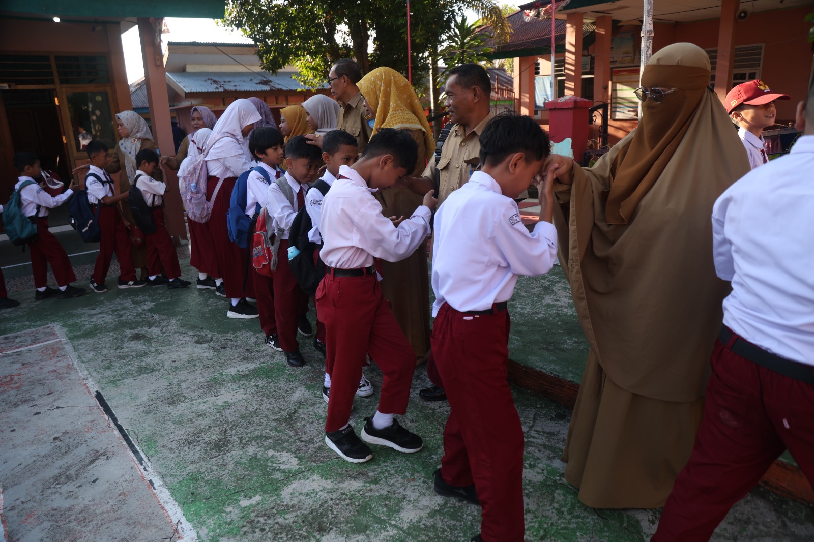 Sebelum memulai pembelajaran, siswa dan guru melakukan tradisi bersalaman sebagai tanda kasih dan permohonan maaf atas kesalahan yang mungkin terjadi selama libur lebaran.