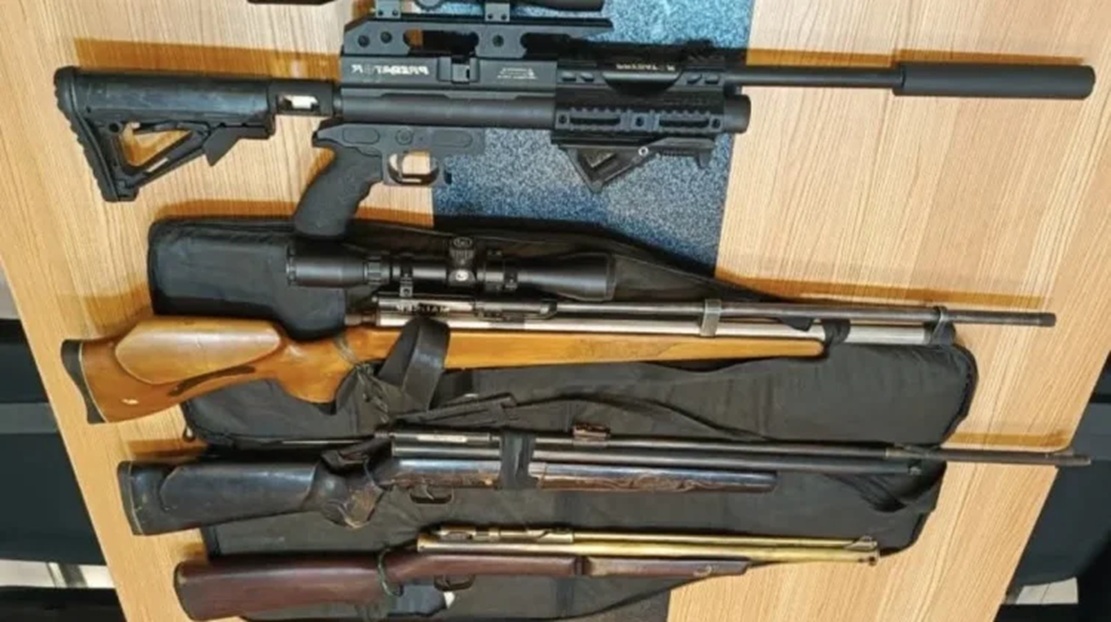 Sejumlah barang bukti yang diamankan ini berupa parang, senapan angin yang dilengkapi dengan teleskop, komponen senapan angin hingga satu unit bom rakitan yang disimpan di salah satu lokasi.