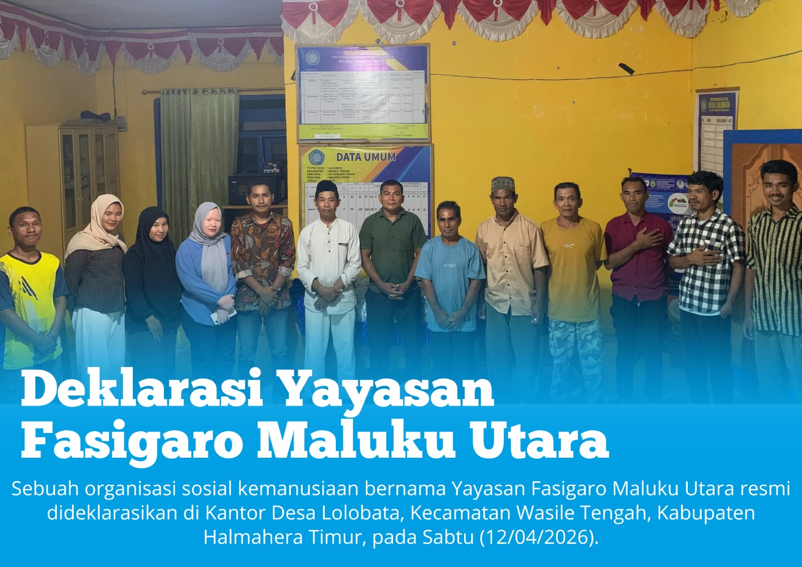 TopikBerita.id., Halmahera Timur– Di tengah hiruk pikuk dinamika kehidupan dan berbagai tantangan zaman, lahirlah semangat baru untuk membawa perubahan yang lebih baik. Sebuah organisasi sosial kemanusiaan bernama Yayasan Fasigaro Maluku Utara resmi dideklarasikan di Kantor Desa Lolobata, Kecamatan Wasile Tengah, Kabupaten Halmahera Timur, pada Sabtu (12/04/2026).